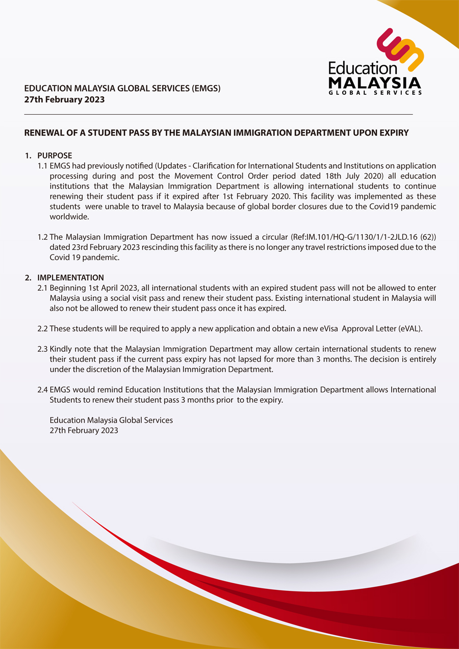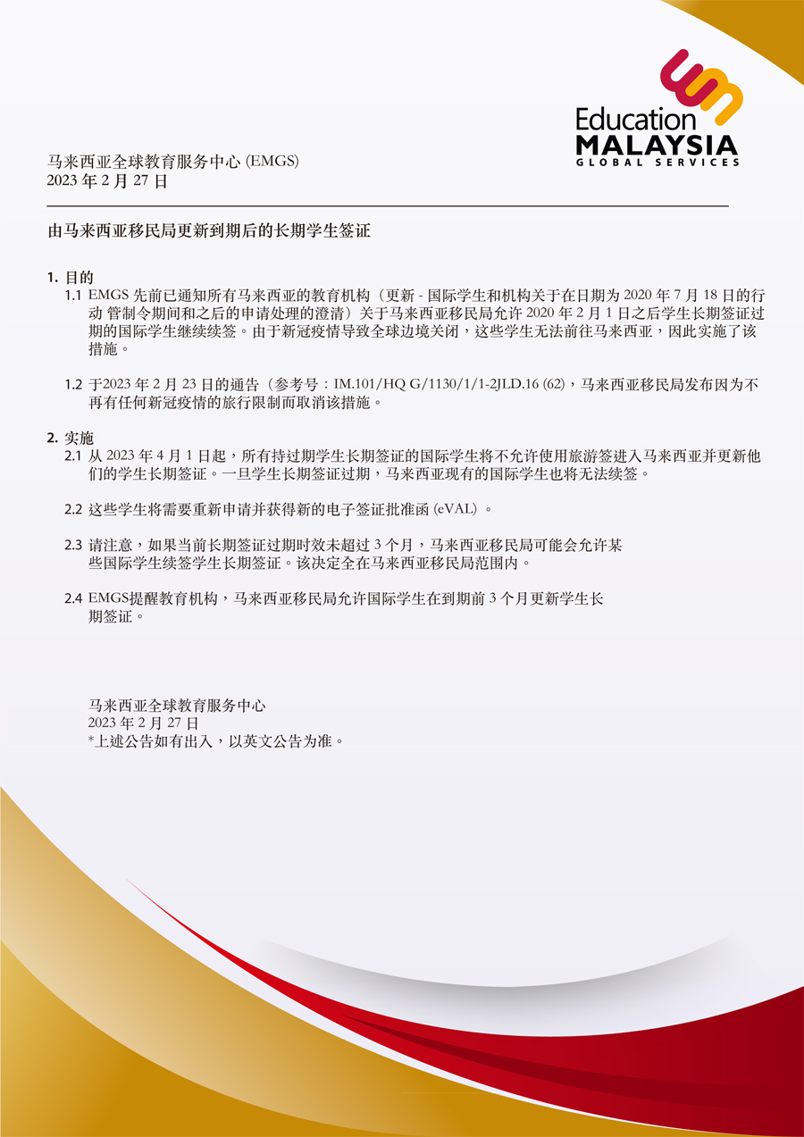 自2023年4月1号之后,凡持有马来西亚学生长期签证的在籍国际学生,尚未入境马来西亚且学生长期签证已经过期的情况,均需要在入境马来西亚前重新申请eVAL,获得批准后办理贴签手续完备后入境马来西亚。(仅供参考,一切以EMGS英文公告为准)